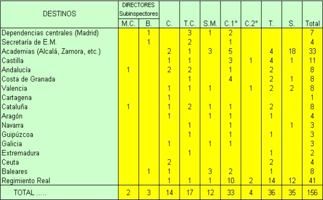 Distribución de los Jefes y Oficiales del Real Cuerpo de Ingenieros en 1808. FUENTE: Memorial de Ingenieros. Mayo de 1908. Año LXIII. Número V. Página 188 El detalle de los destinos en la Península es el que muestra el siguiente cuadro: