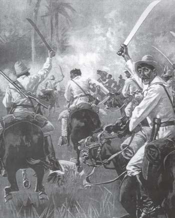 Mambises rebeldes atacando. El nombre de "mambises" tuvo su origen en la isla de Santo Domingo, procedente de Juan Ethninius Mamby, oficial negro español que se unió a los revolucionarios dominicanos durante la guerra de independencia de 1846, a quienes las tropas españolas pasaron a llamar "hombres de Mamby". El término tuvo éxito y pasó a ser posteriormente aplicado a los insurrectos cubanos.