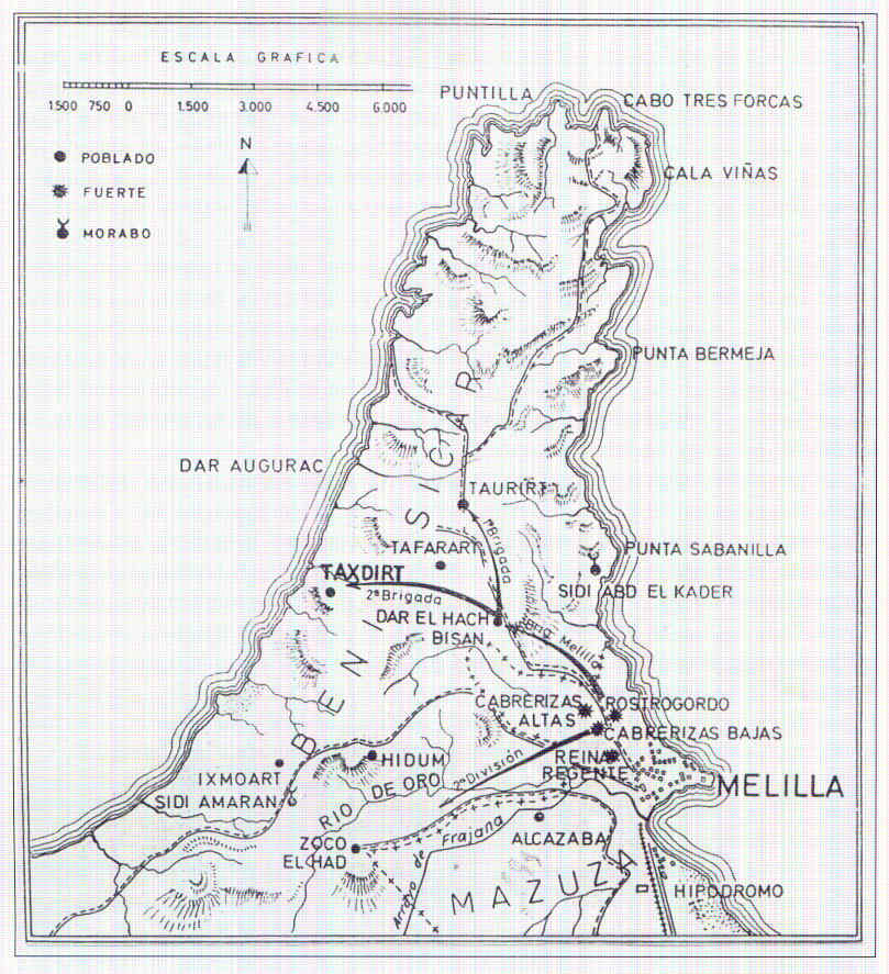 Centro: general Marina, al frente de dos compañías del Batallón Disciplinario y otras dos del regimiento África, apoyada por una batería de montaña. Su misión era tomar la loma de Sidi Hamet el-Hach.