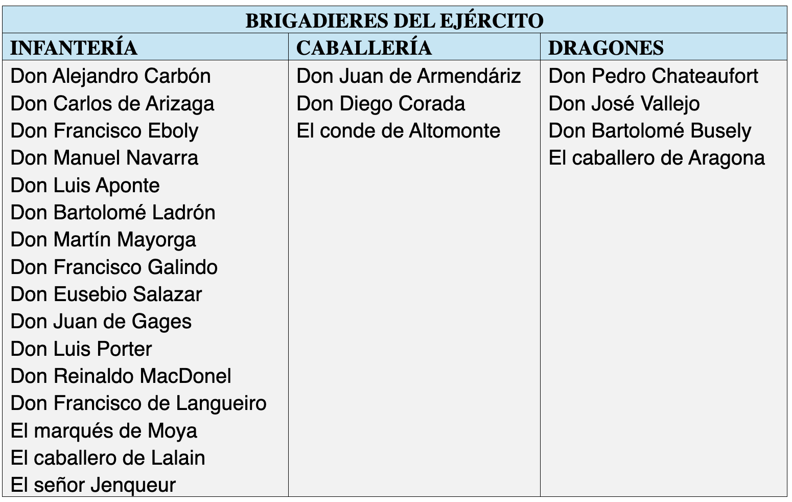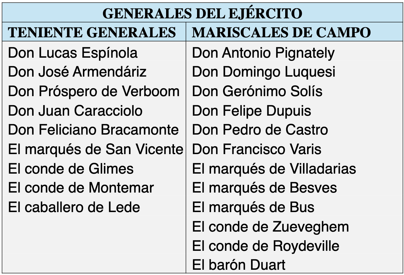 El generalato del ejército estaba formado por 44 oficiales: nueve tenientes generales, doce mariscales de campo, y veintitrés brigadieres.
