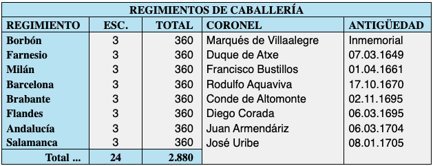 1.160 jinetes para encuadrarlos en un escuadrón de Guardias de Corps Flamenca de 200 plazas y seis escuadrones de 160 jinetes cada uno, pertenecientes a dos nuevos regimientos de Caballería de 480 plazas cada uno: Orán y Sicilia.