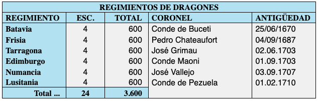 6.000 dragones para crear 40 nuevos escuadrones de 10 nuevos regimientos de Dragones: Ampurdán, Rivagorza, Zaragoza, Mérida, Palma, Llerena, Francia, Cartagena, Jerez y Caller.