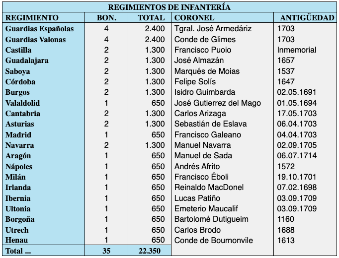 Todos estos esfuerzos lograron que a mediados de junio de 1718 se hubiera reunido un ejército expedicionario formado por unos 29.000 soldados encuadrados en 35 batallones de Infantería y 48 escuadrones de Caballería y Dragones pertenecientes a 36 regimientos.