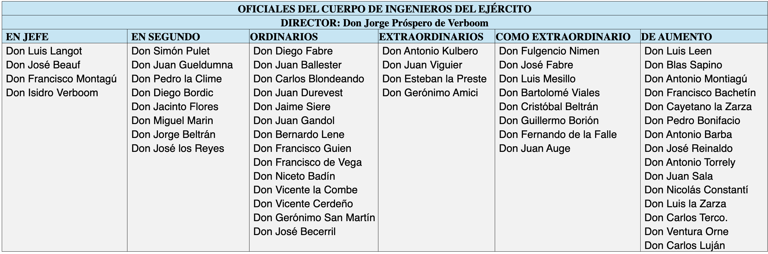 El Ingeniero General don Jorge Próspero de Verboom fue nombrado Jefe de Ingenieros y Cuartel Maestre del ejército expedicionario, al mando de 53 oficiales del Real Cuerpo de Ingenieros.
