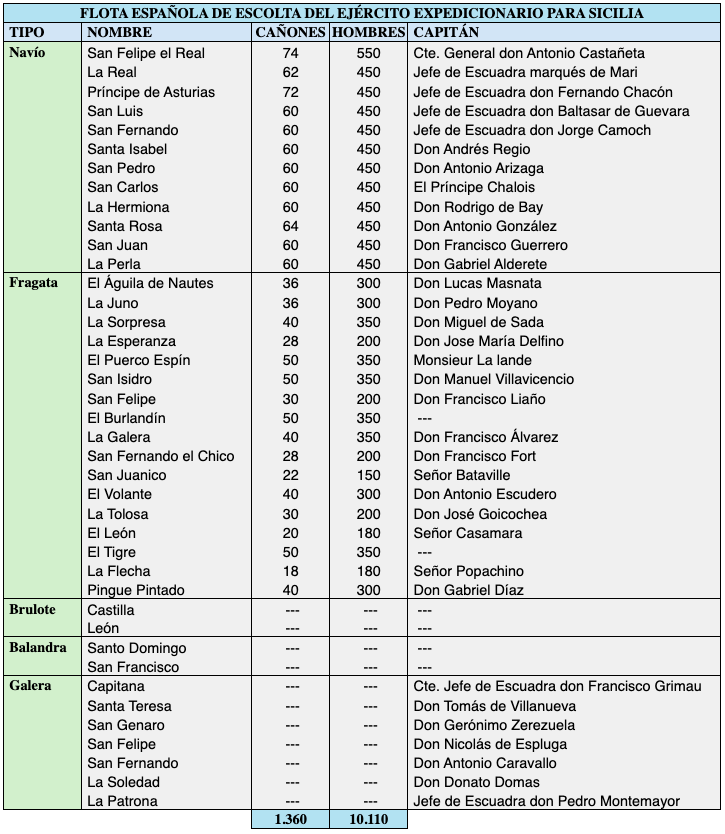 En resumen, el ejército expedicionario español para la campaña de Sicilia estaba formado por casi 40.000 efectivos: