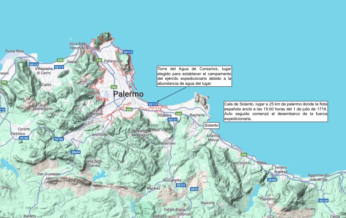 La flota expedicionaria navegó frente a la ciudad de Palermo en dirección Levante en busca de un lugar donde desembarcar. Los habitantes de la ciudad y sus alrededores observaban curiosos la enorme flota que se les aproximaba con sentimientos encontrados. Unos, que tenían el recuerdo del gobierno de España de en la isla mediante los reyes de Aragón y de la Casa de Austria desde hacía varios siglos, tenían la esperanza de que aquel ejército les librara del yugo piamontés que les gobernaba hacía pocos años y que les devolviera sus antiguas libertades que respetaban los reyes españoles; otros, partidarios del duque de Saboya y de su política centralizadora, deseaban que fracasara el desembarco de aquel ejército.