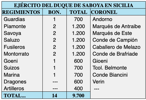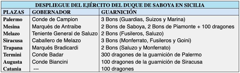La guarnición que el duque de Saboya, rey de Sicilia, mantenía en la isla: 9.700 soldados encuadrados en catorde batallones de Infantería, un regimiento de Dragones y 400 artilleros repartidos en las plazas ocupadas.