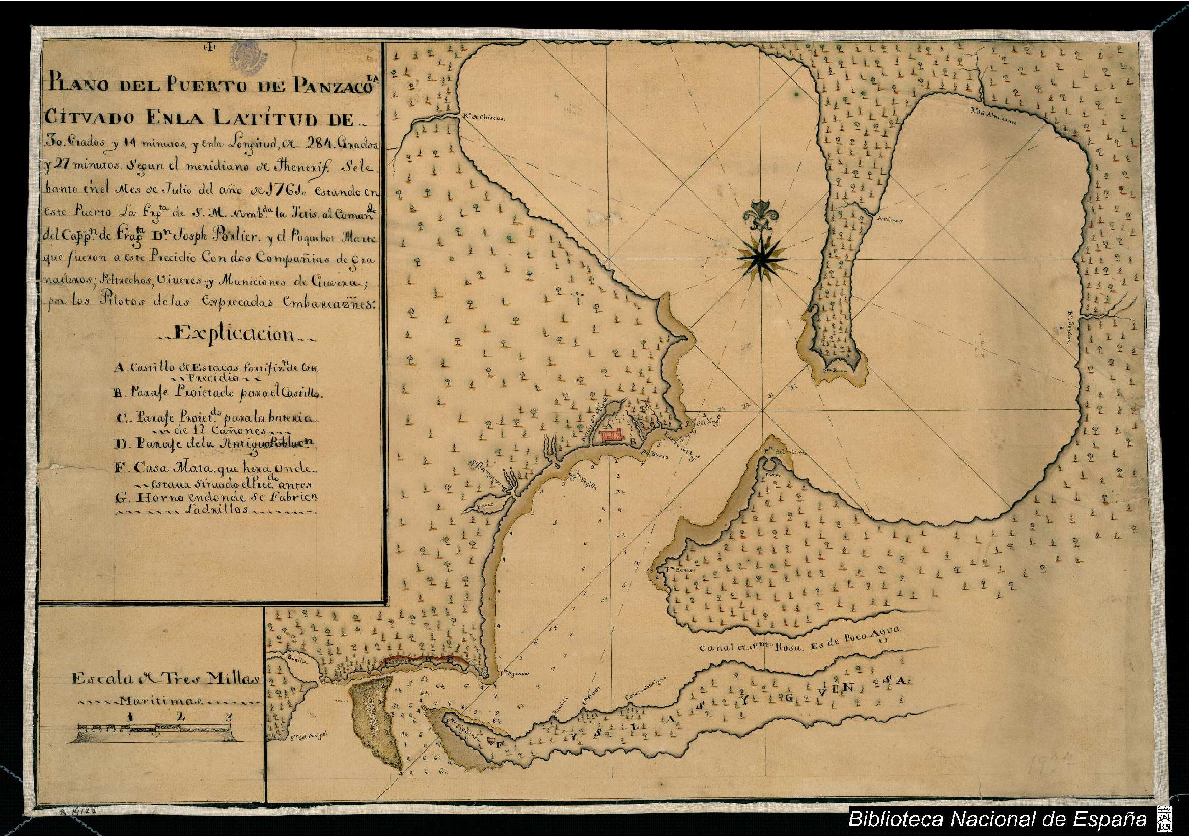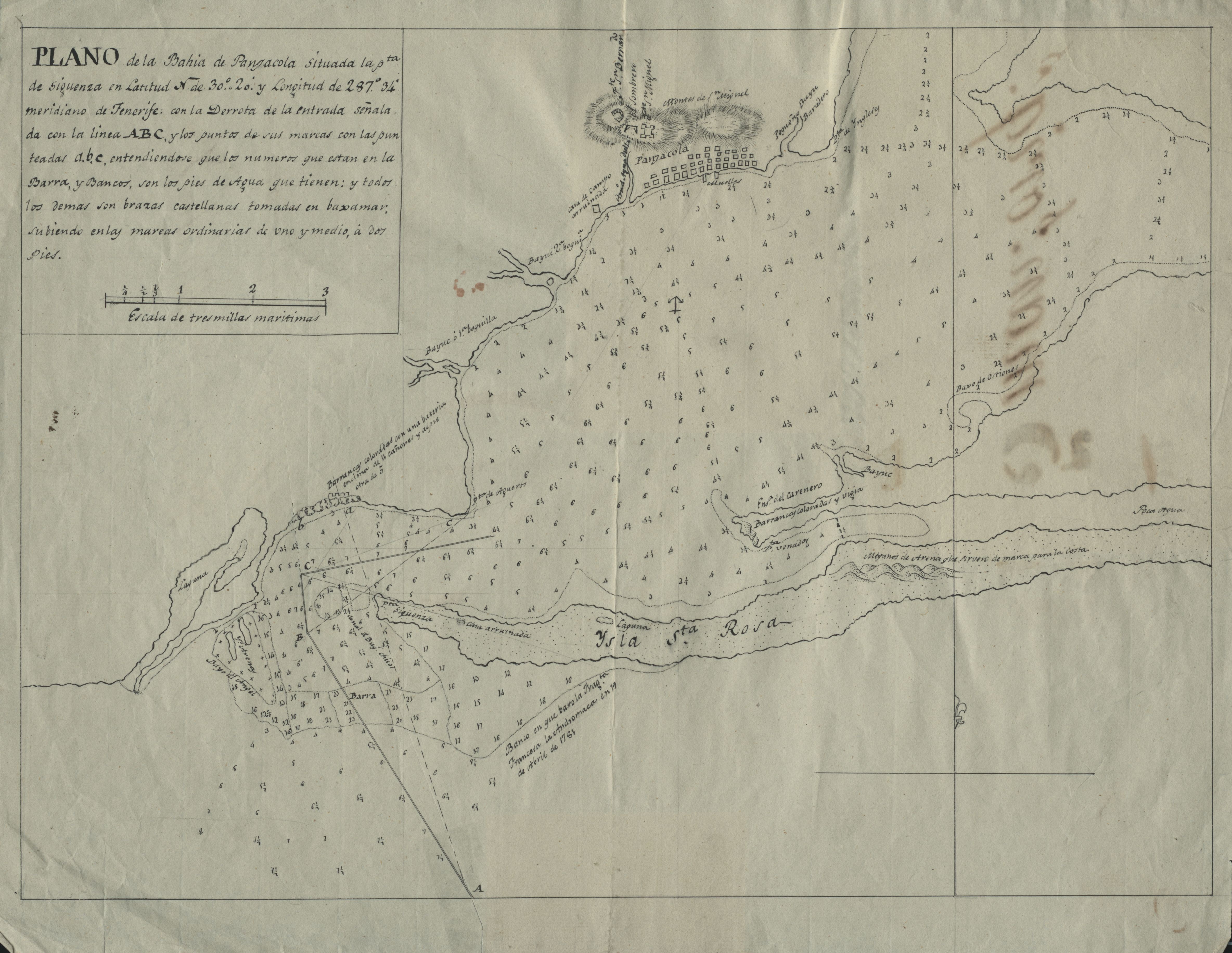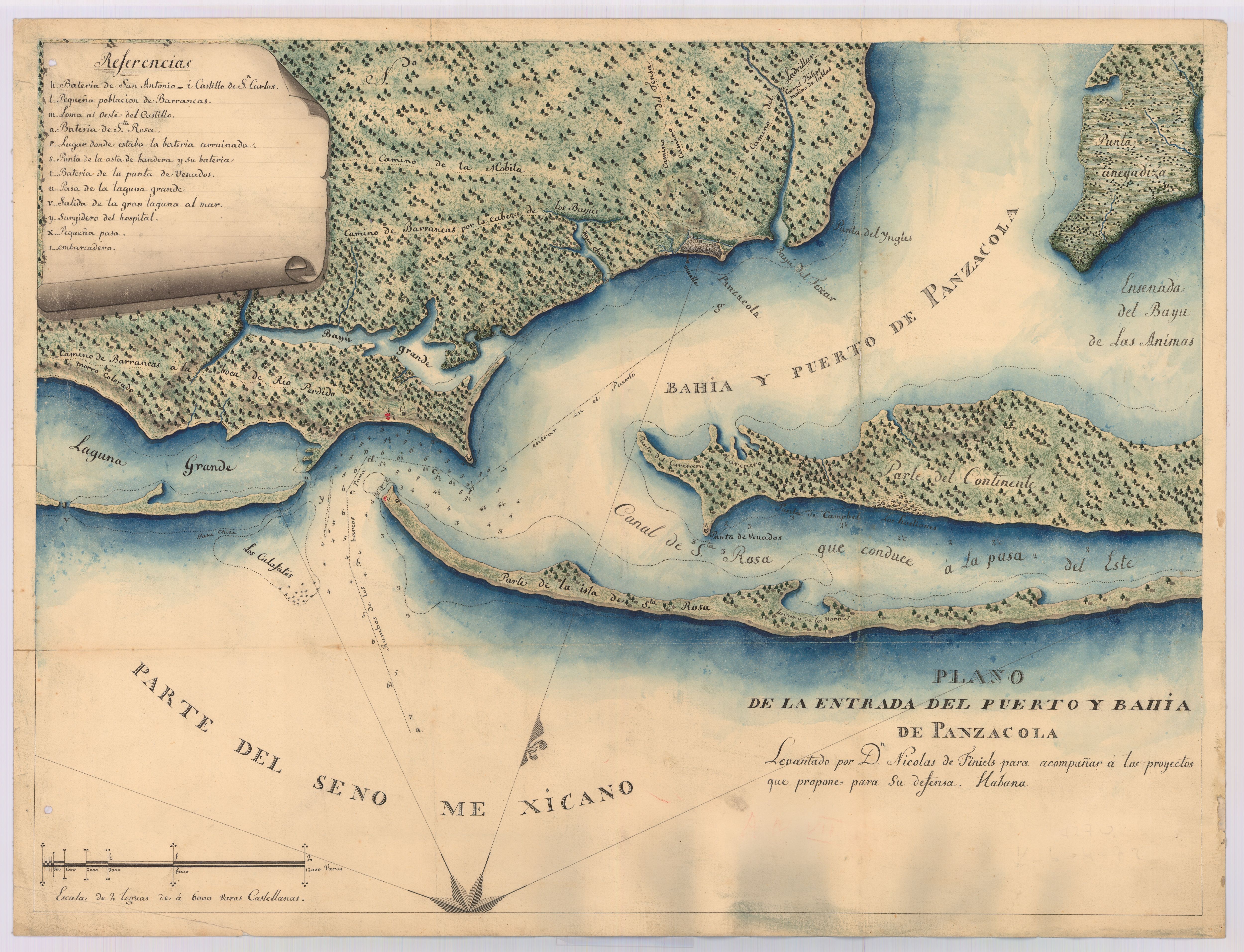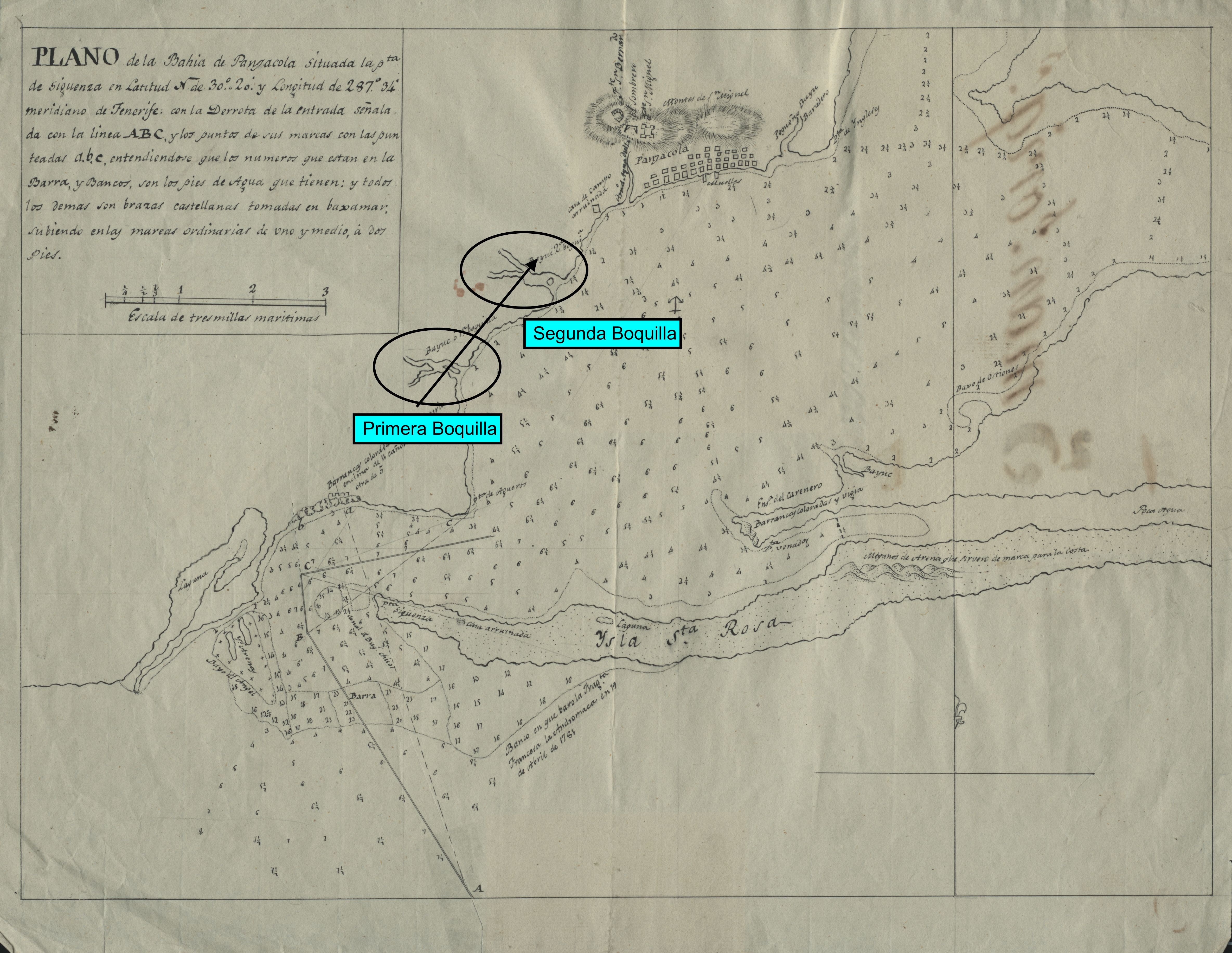 Mapas de 1761, cuando la bahía de Pensacola aún pertenecía a España, realizado con ocasión del traslado al presidio de dos compañías de granaderos y pertrechos de guerra a bordo de la fragata Tetis y del paquebote Marte, al mando del capitán de fragata don José Porlier (Fuentes: Mapa de la izquierda, Biblioteca Virtual de Defensa, ref: Ar.J-T.1-C.4_76; mapa de la derecha, Biblioteca Nacional de España.)El 4 de marzo Gálvez se reunió a bordo del San Ramón con todos los comandantes de la fuerza expedicionaria para anuniarles que se dirigían a la isla de Santa Rosa, en la entrada de la bahía de Pensacola, para desembarcar en ella, atacar la batería que los británicos tenían emplazada en la punta de Sigüenza y, posteriormente, entrar en la bahía sin esperar los socorros de Luisiana y Mobila. El plan fue muy bien acogido por los oficiales de la Armada.