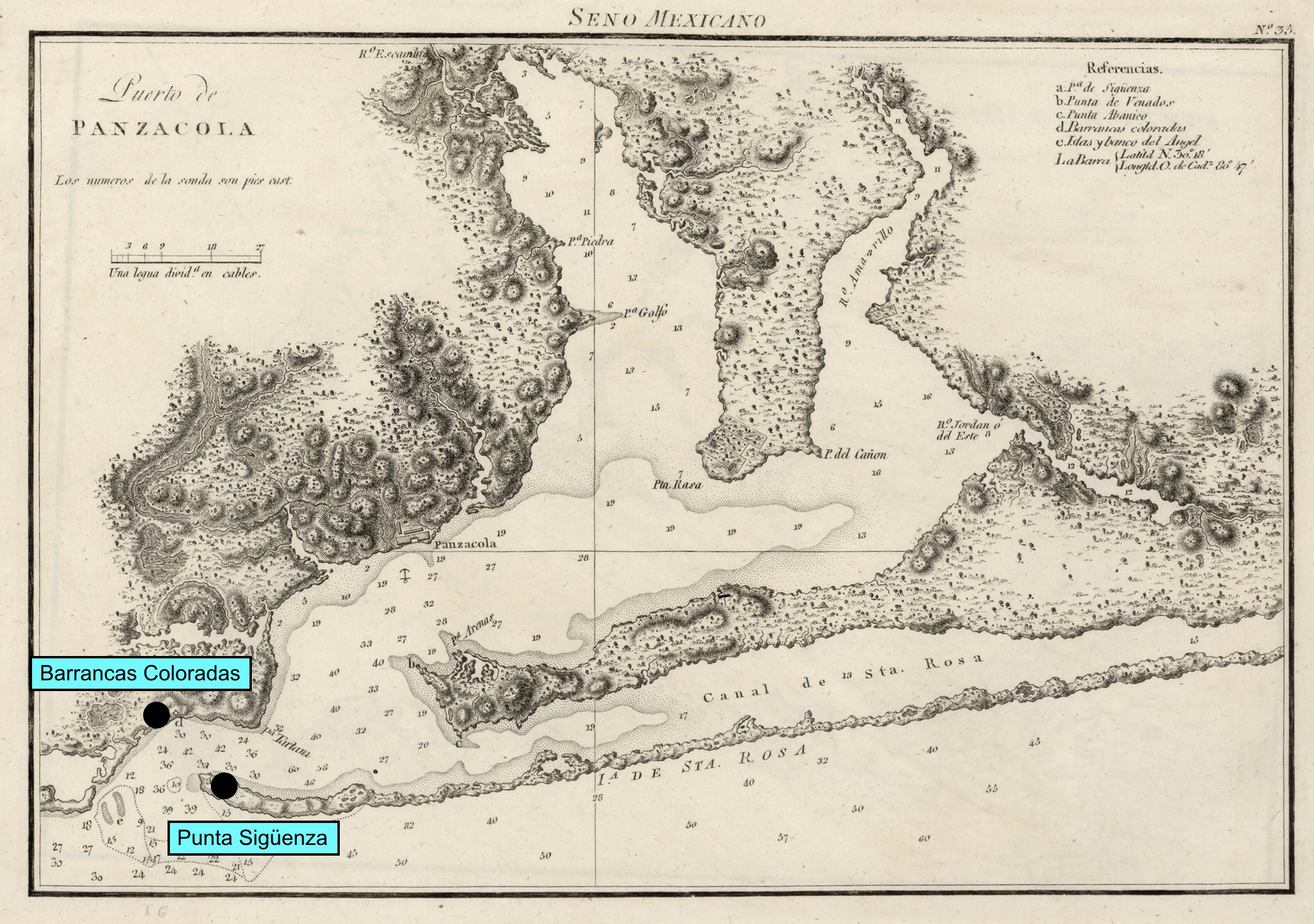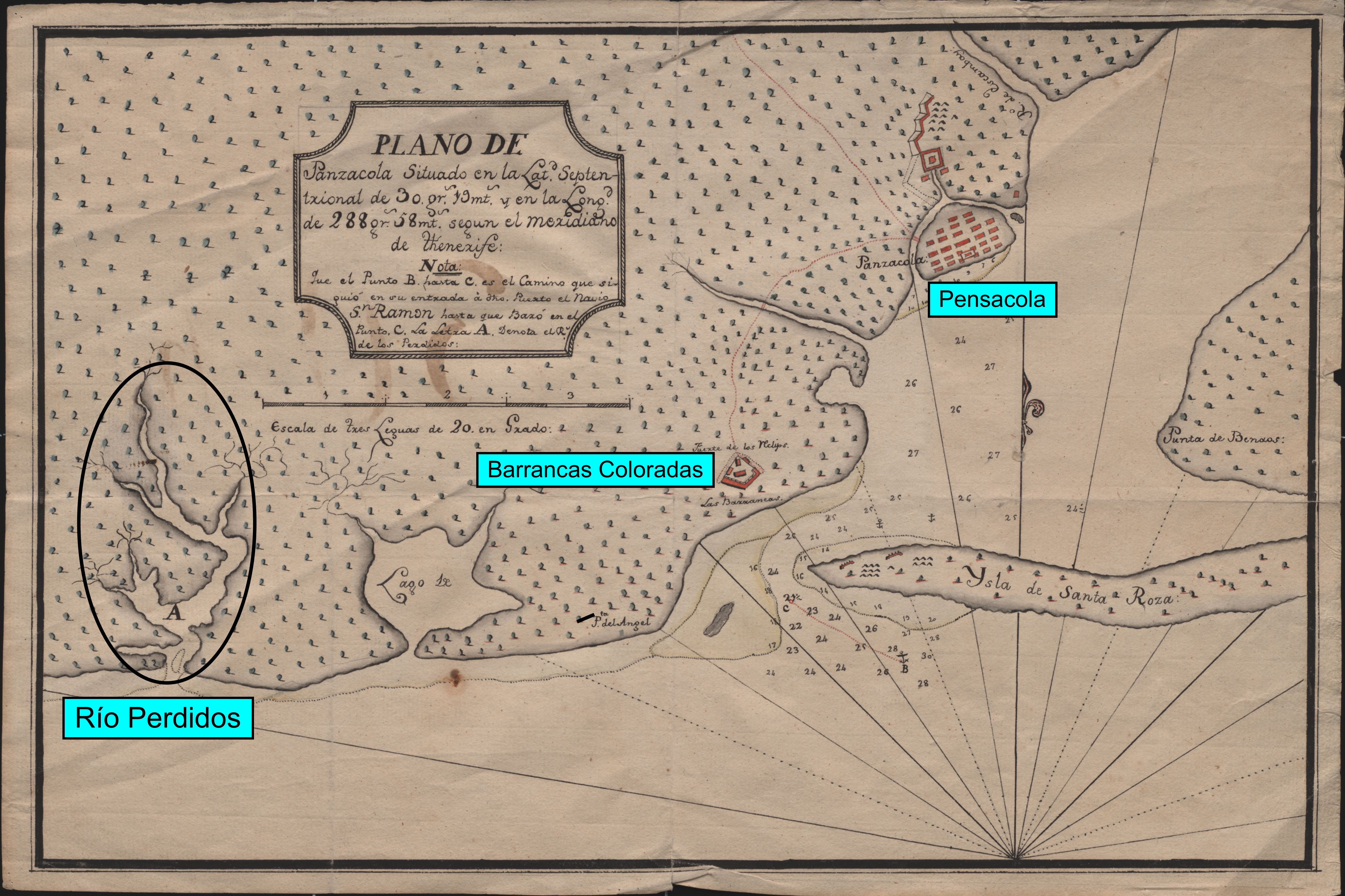 La entrada a la bahía de Pensacola se hacía por un estrecho canal de apenas mil metros de anchura, con unos 6 ó 7 pies de profundidad en pleamar aproximadamente por el centro, profundidad que podría modificanrse según el estado de la mar. En el lado de tierra firma un fuerte denominado Barrancas Coloradas, llamado Red Cliffs por los británicos, defendía el paso con 11 cañones, cinco de ellos de a 32 pulgadas, con una guarnición de 139 hombres. Enfrente, en la punta de Sigüenza de la alargada isla de Santa Rosa, los británicos habían emplazado otra pequeña batería.