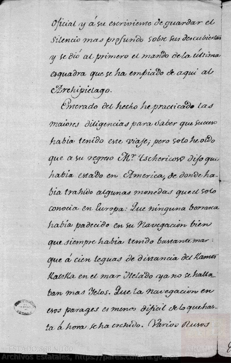 Mui señor mío: Estos días he sabido con bastante certeza que el año de 1769 emprehendió un oficial de marina Ruso, llamado Tschricow, la continuación de las descubiertas que solicita esta nación entre el Kamtschatka y la América. Que este Oficial bolvió en 1771 a uno de los puertos del Kamtschatka, con su navío en buen estado, sin faltarle un hombre de su tripulación. Se testituyó a esta Corte a principios del año pasado con solo su escriviente, habiendo dejado en Siberia las demás Personas que le habían acompañado en su expedición. Entregó todos sus papeles al Ministerio, quien los depositó en los Archivos, sellados con tres sellos. Hizo prestar juramento a este Oficial y a su escriviente deguardar el silencia más profundo sobre sus descubiertas y se dió al primero el mando de la última esquadra que se ha embiado de aquí al Archipiélago.