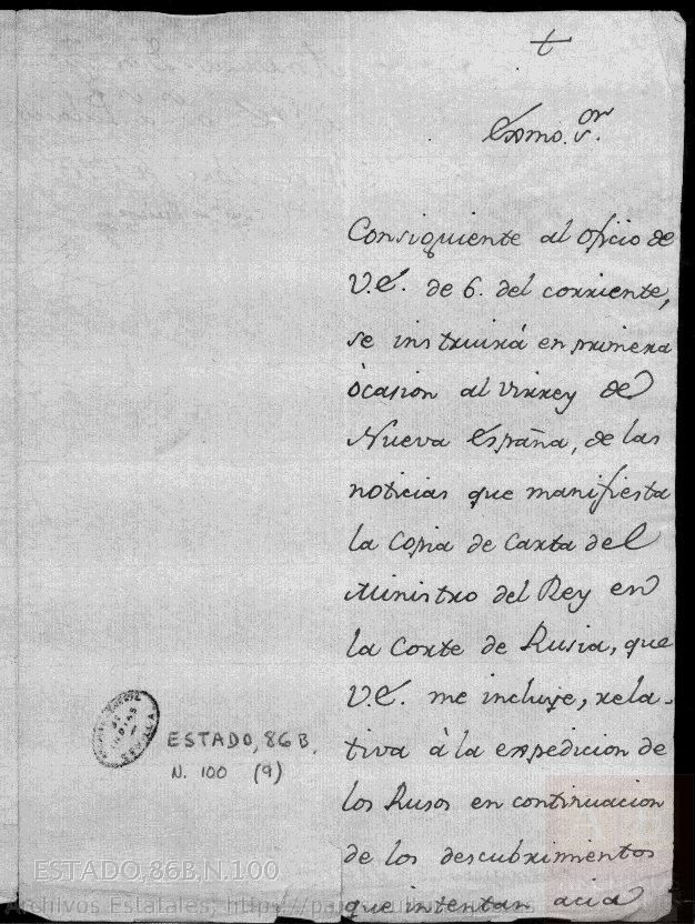 Consiguiente al oficio de V.E. de 6 del corriente, se instruirá en primera ocasión al Virrey de Nueva España, de las noticias que manifiesta la copia de Carta del Ministro del Rey en la Corte de Rusia, que V.E. me incluye, relativa a la expedición de los Rusos en continuación de los descubrimientos que intentan acia América.