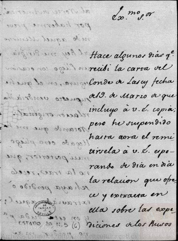 Hace algunos dias que recibi la carta del Conde de Lascay (sic) fecha de 19 de Marzo de que incluyo a V.E. copia; pero he suspendido hasta aora el remitirsela a V.E. esperando de dia en dia la relacionque ofrece y extracta en ella sobre las expediciones de las Rusos al Norte de America, por haberme prevenido aquel Ministro del Rey me dirigía un Pliego con ocasion segura, en el que he supuesto endria la relacion original.