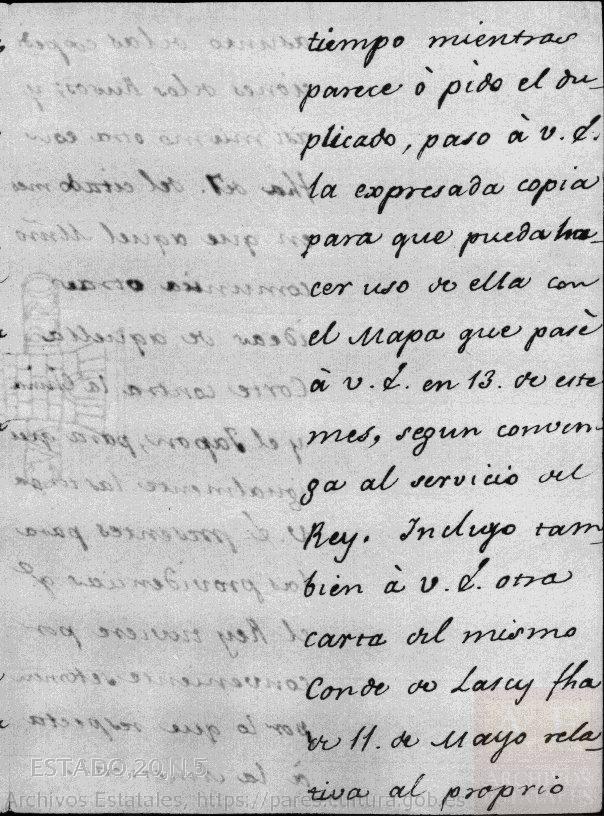Notando que me ha llegado otro pleigo mui posterior, que no la trae, recelo se haya perdido o extraviado aquel, y en esta duda para no perder mas tiempo mientras parece o pido el duplicado, paso a V.E. la expresada copia para que pueda hacer eso de ella con el Mapa que pasé a V.E. en 13 de este mes, segun convenga al servicio del Rey. Incluyo tambien a V.E. otra carta del mismo Conde de Lascy fecha de 11 de mayo relativa al proprio asunto de las expediciones de los Rusos; y asi mismo otra con fecha 7 del citado mes en que aquel Ministro comunica otras ideas de aquella Corte contra la China y el Japón, para que igualmente las tenga V.E. presentes para las providencias que el Rey tuviere por conveniencia se tomen por lo que respecta a la America.