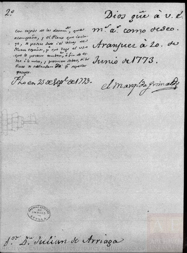 Oficio de remisión a don Julián de Arriaga, secretario de Estado de Marina, fechado el 20 de junio de 1773.