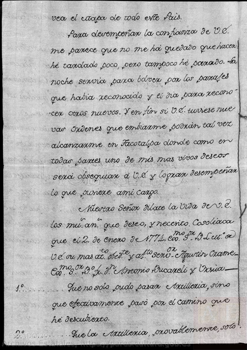 Mui Señor mio: La carta que escribí a V.E. de Tecoantepeque el día 28 de pasado estava teñida con el sentimiento de no haver encontrado hasta entonces el camino que pudo llebar la Artillería. Salí de aquella Villa con este disgusto, y antes de dar la buelta por el camino que me habían informado, me empeñé en el reconocimiento por la Sierra, que está a nueve leguas de Tecoantepeque, y buscando de unos cerros en otros los parages mas aparentes, como si mi idea hubiera sido abrir camino nuevo, di por fortuna mia no solo con el camino por donde pudo pasar la Artillería, sino por donde efectivamente pasó, siendo prueba incontestable de esta verdad los desmontes repetidos que hallé en las laderas de los cerros para formar camino espacioso para ruedas, cosa que en estos paises no pudo practicarse sino para semejante fin: pues en el Camino Real, por no dar los Yndios quetro golpès de hazada, van los Pasageros al pasar la Sierra con peligro de despeñarse como sucedió con una de mis cargas, y ha sucedido a otros muchos, especialmente quando hay Nortes.