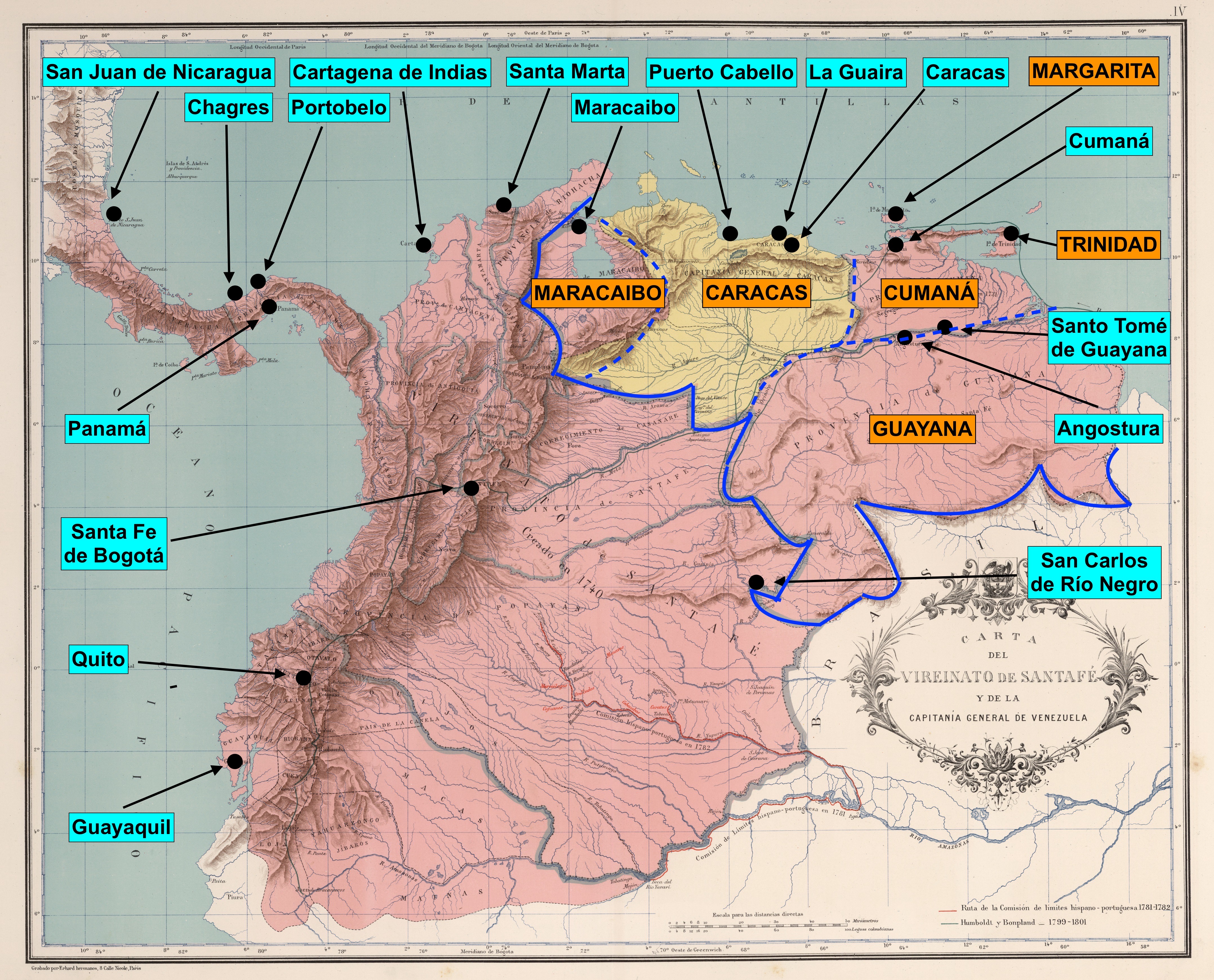 En el sudoeste se encontraban las provincias de Santa Marta, Cartagena de Indias y Panamá, territorios del norte del virreinato de Nueva Granada y vecinos de la recién creada Capitanía General de Caracas.
