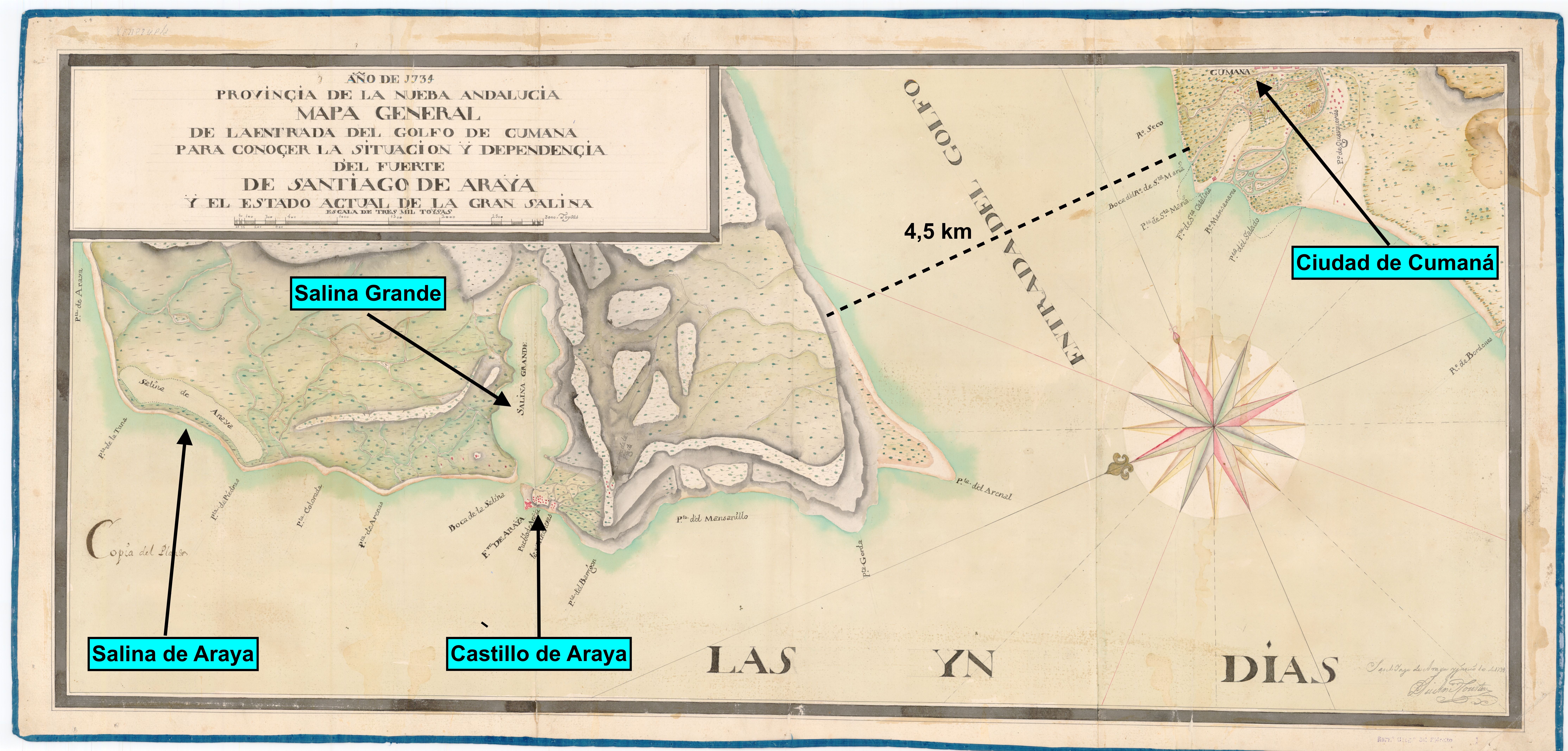 En la punta occidental de la península de Araya existían dos salinas, una costera, muy accesible desde el mar, y otra interior, separada del mar por una estrecha barrera de tierra. En esta última los bloques de sal se cortaban como "los sillares en las canteras" y dos días después las cavidades producidas por el corte se encontraban de nuevo rellenas de sal coagulada y formada, formando el conjunto una salina "tan abundante que se ha creido inagotable".